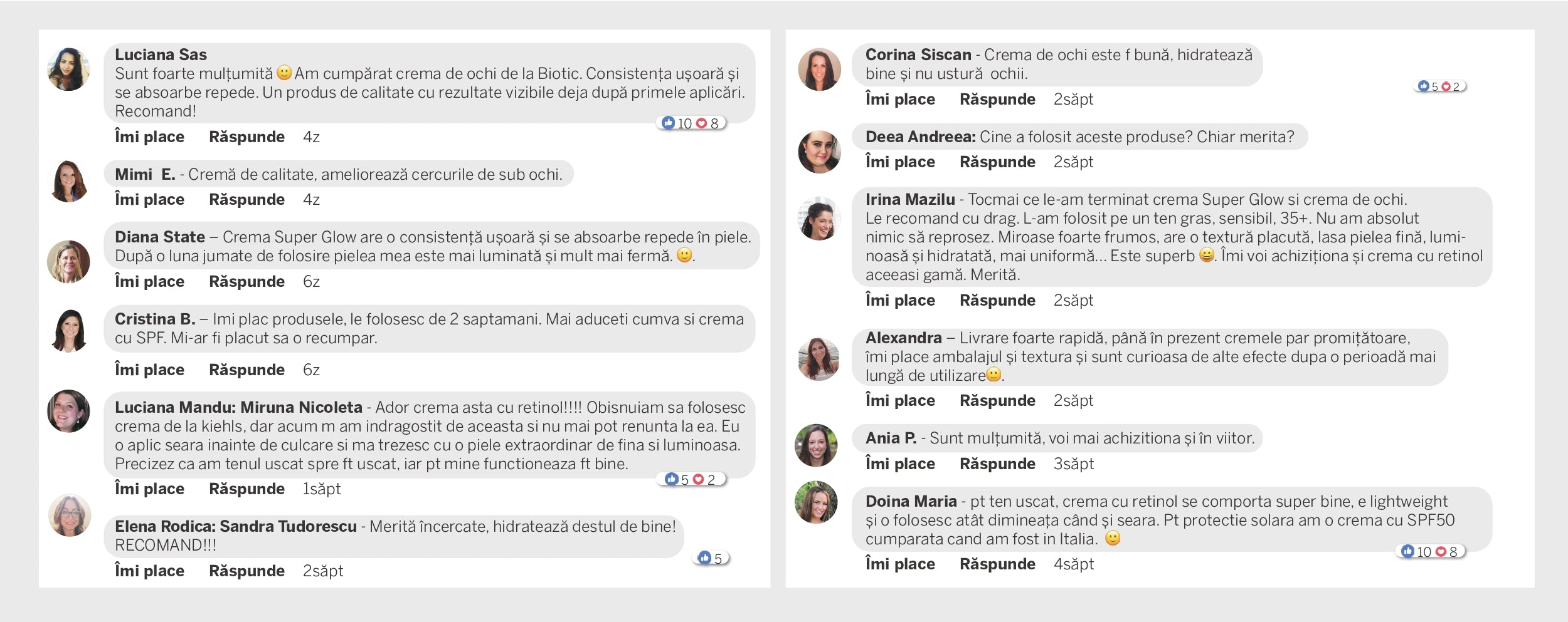Îmi plac produsele voastre și mă regăsesc . Sunt mama a 2 copii mici cu puține posibilități materiale pentru creme și seruri scumpe , dar cu produsele de la voi mă regăsesc . Mulțumesc